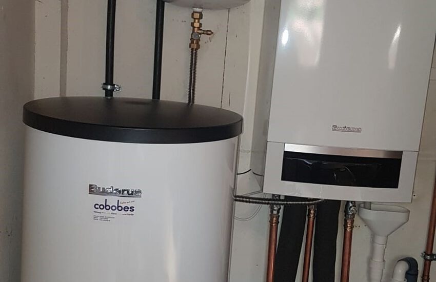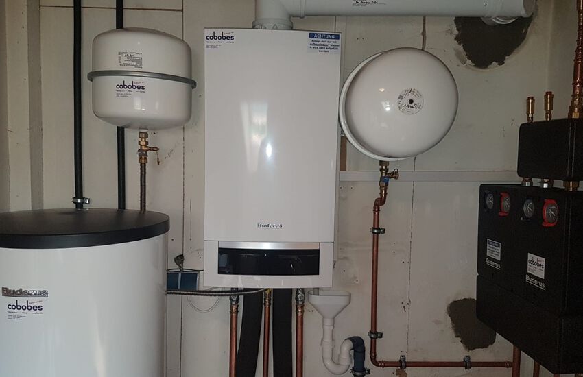 Einbau eines Gasbrennwertgerätes mit nebengestellten Warmwasserbereiter, Fabrikat: Buderus