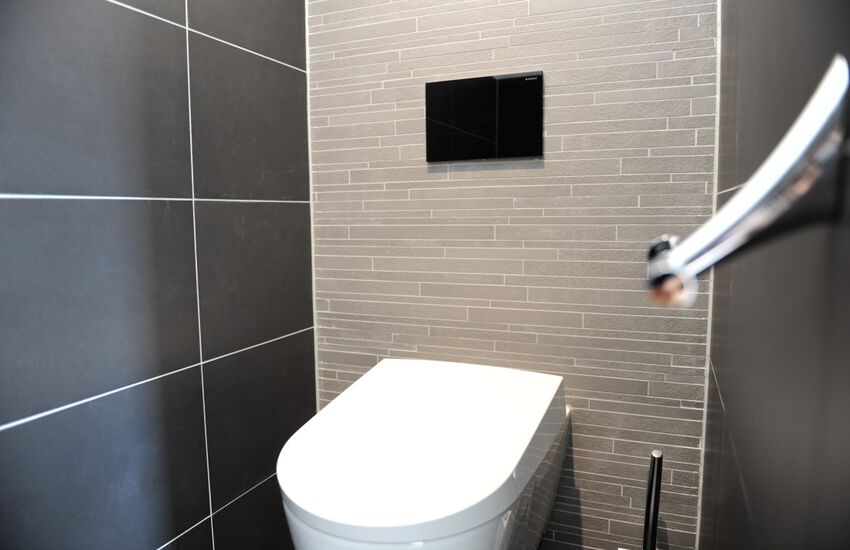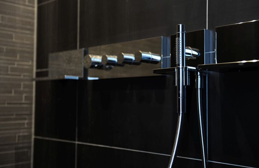 - Gemauerte Dusch mit Duschhimmel mit LED-Beleuchtung, Hansgrohe und beleuchteter Duschrinne, Aco