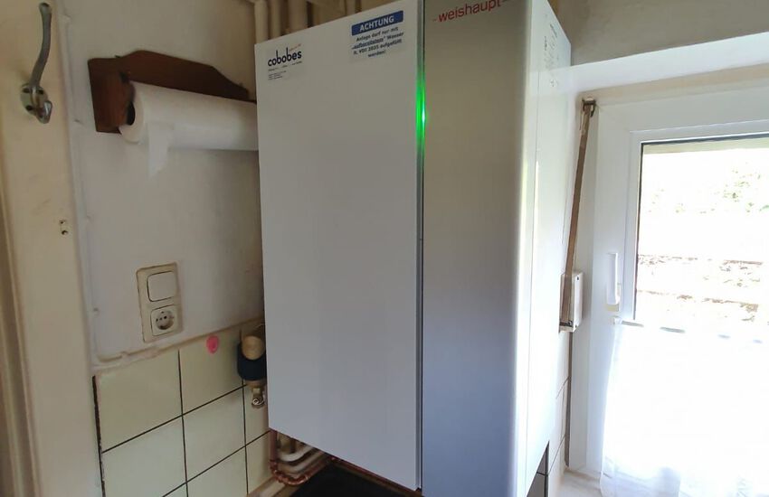 Einbau einer Gasbrennwertanlage mit nebengestellten Warmwasserbereiter, Fabrikat: Weishaupt