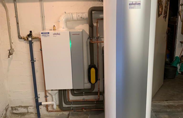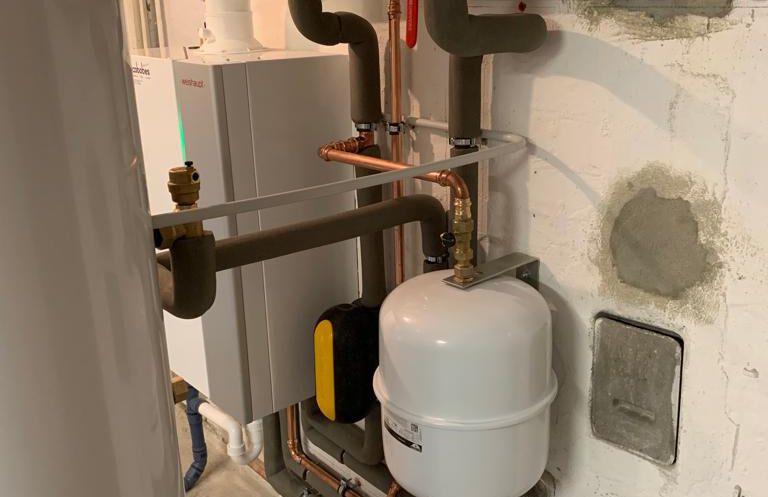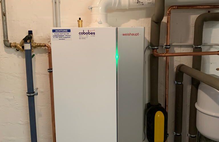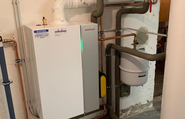 Einbau einer Gasbrennwertanlage mit nebengestellten Warmwasserbereiter, Fabrikat: Weishaupt