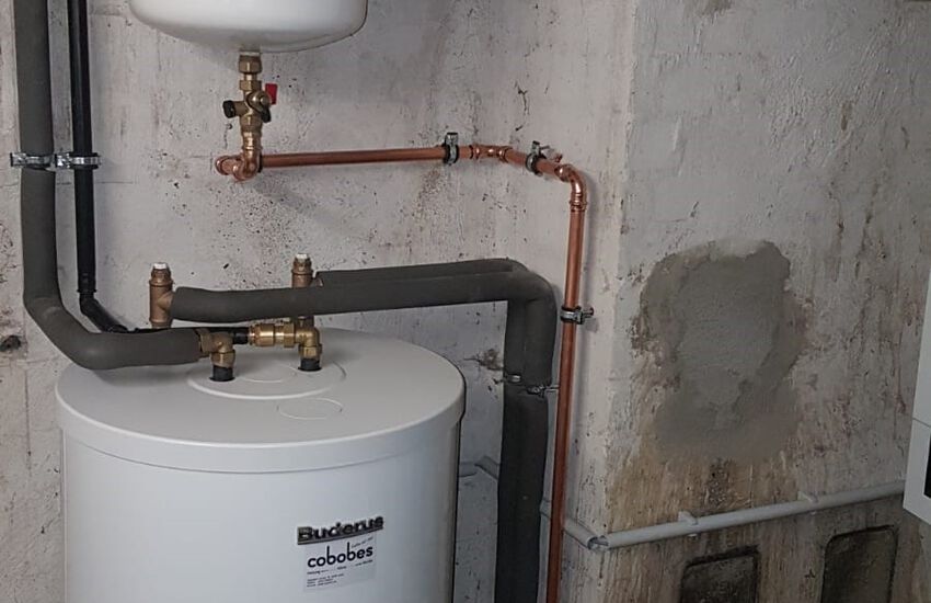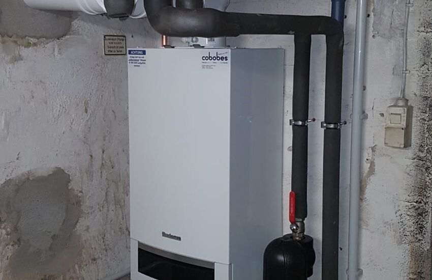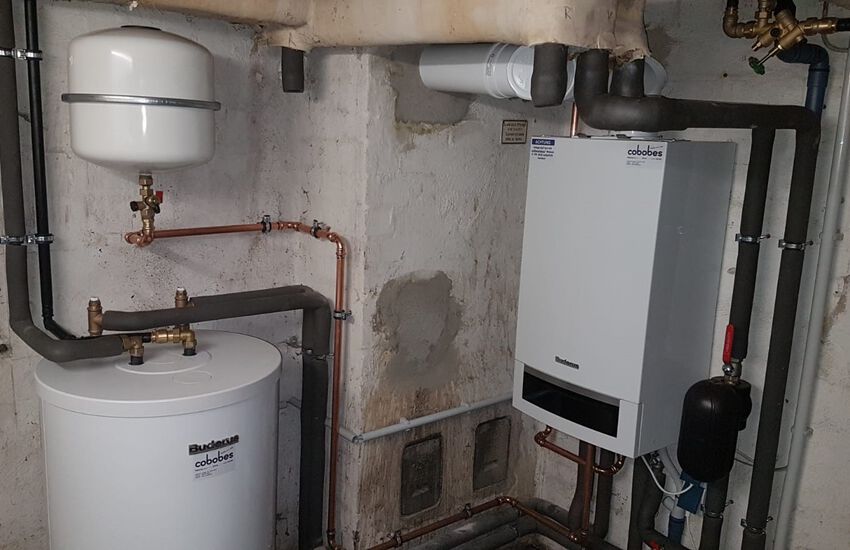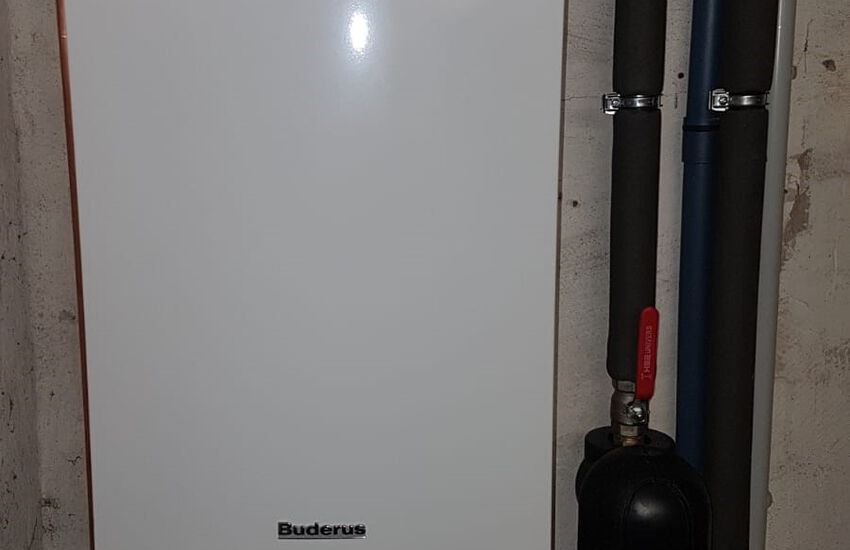 Einbau eines Gasbrennwertgerätes mit nebengestellten Warmwasserbereiter, Fabrikat: Buderus