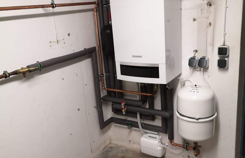 Einbau eines wandhängenden Gasbrennwertgerätes mit Warmwasser im Durchlaufprinzip, Fabrikat: Buderus