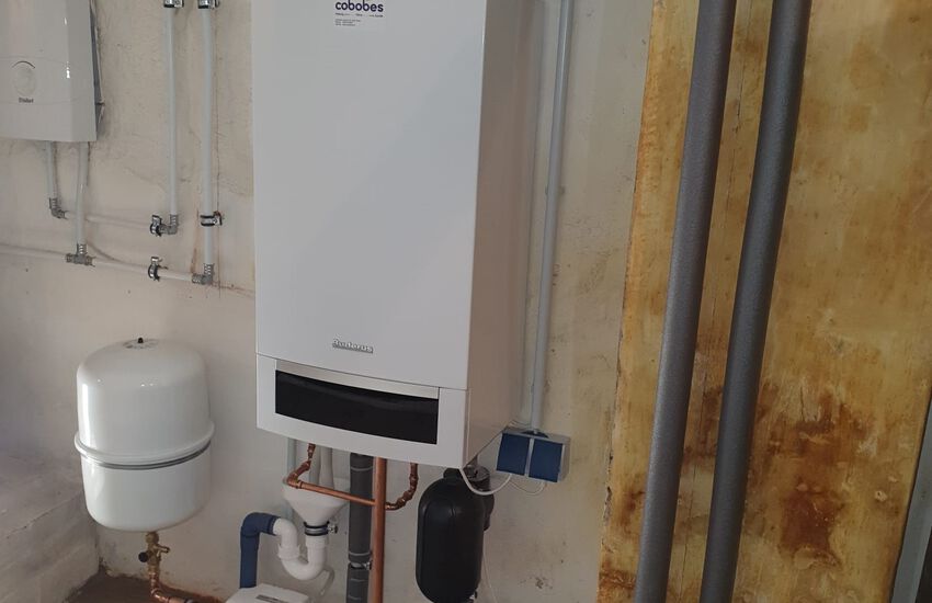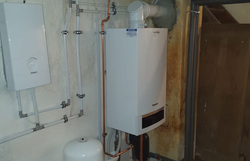 Einbau eines wandhängenden Gasbrennwertgerätes mit Warmwasser im Durchlaufprinzip, Fabrikat: Buderus