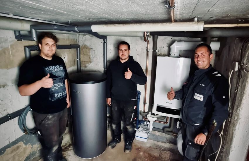 Einbau einer bodenstehenden Gasbrennwertanlage mit nebengestellten Warmwasserbereiter, Fabrikat: Buderus