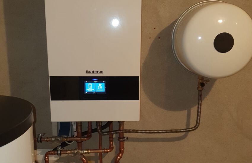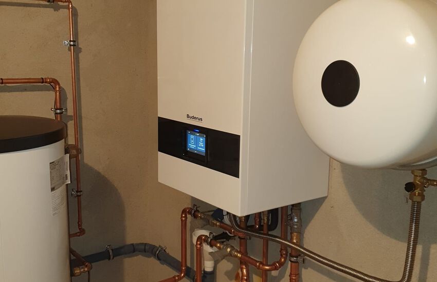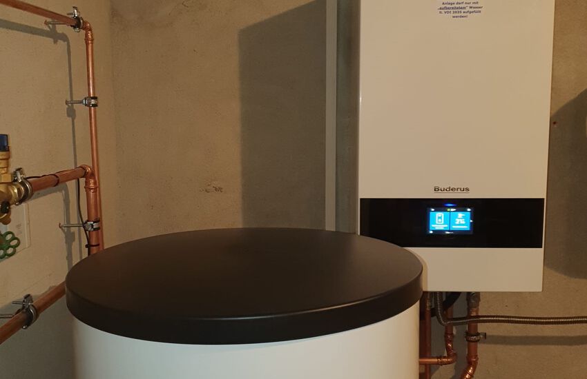 Einbau einer Gasbrennwertanlage mit nebengestellten Warmwasserbereiter, Fabrikat: Buderus
