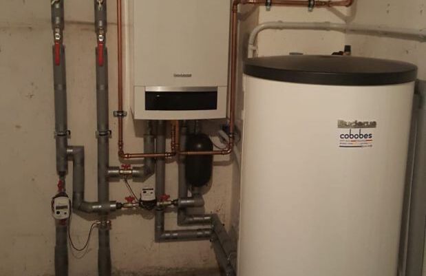 Einbau eines Gasbrennwerttowers mit Warmwasserspeicher, Fabrikat: Weishaupt