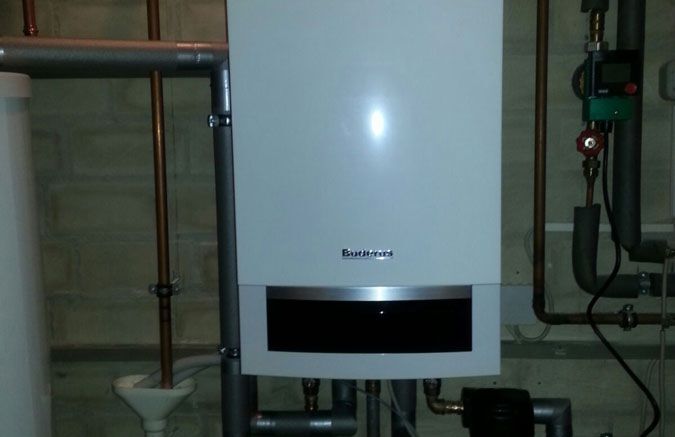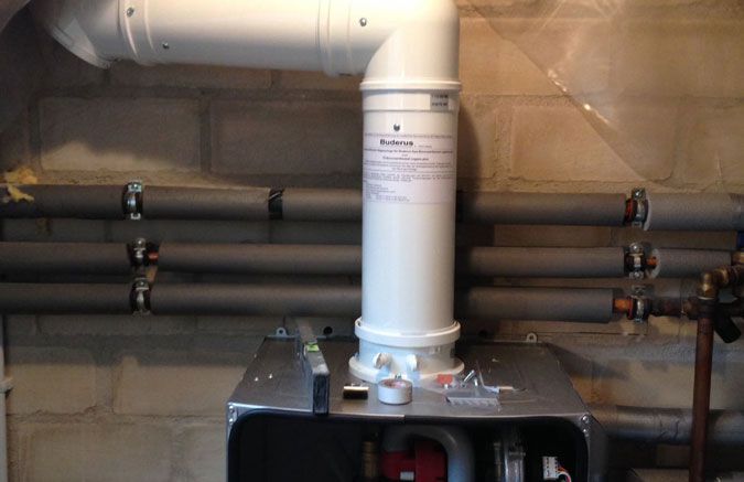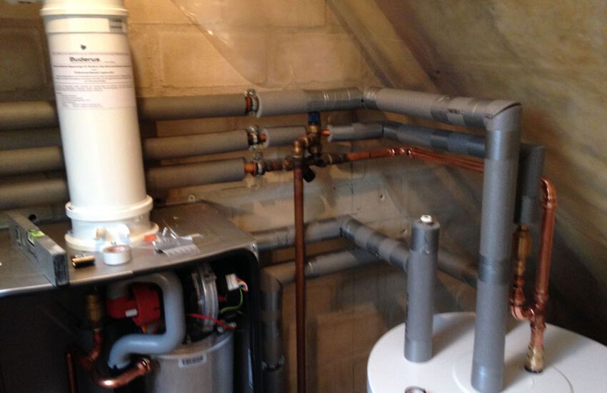 Einbau eines Gasbrennwertgerätes mit nebengestelltem Warmwasserbereiter, Fabrikat: Buderus