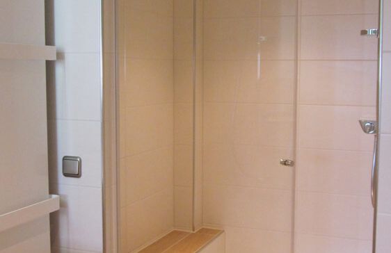 Großzügige Duschanlage mit Sitzbank und bodenebener Duschwanne