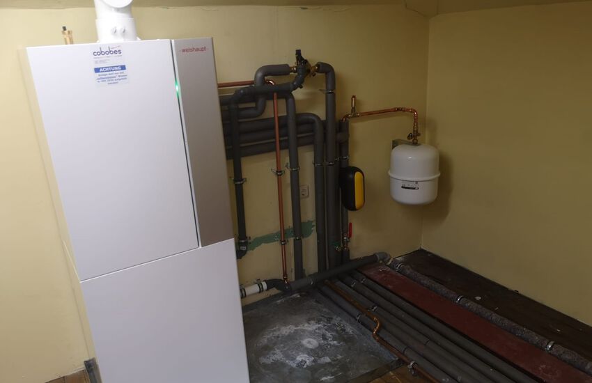 Einbau eines Gasbrennwertgerätes mit untergestellten Warmwasserbereiter, Fabrikat: Weishaupt
