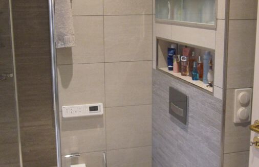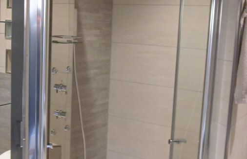 - großzügige Duschanlage mit Sitz und Edelstahl Shower-Paneel