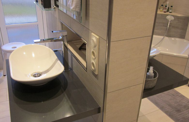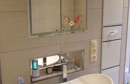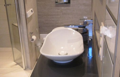 - Doppel-Waschtischanlage spiegelbildlich an eine freistehende Wand montiert