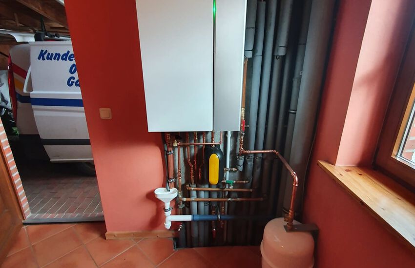 Einbau einer Gasbrennwertanlage mit nebengestellten Warmwasserbereiter, Fabrikat: Weishaupt