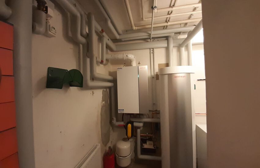 Einbau einer Gasbrennwertanlage mit nebengestellten Warmwasserbereiter, Fabrikat: Weishaupt