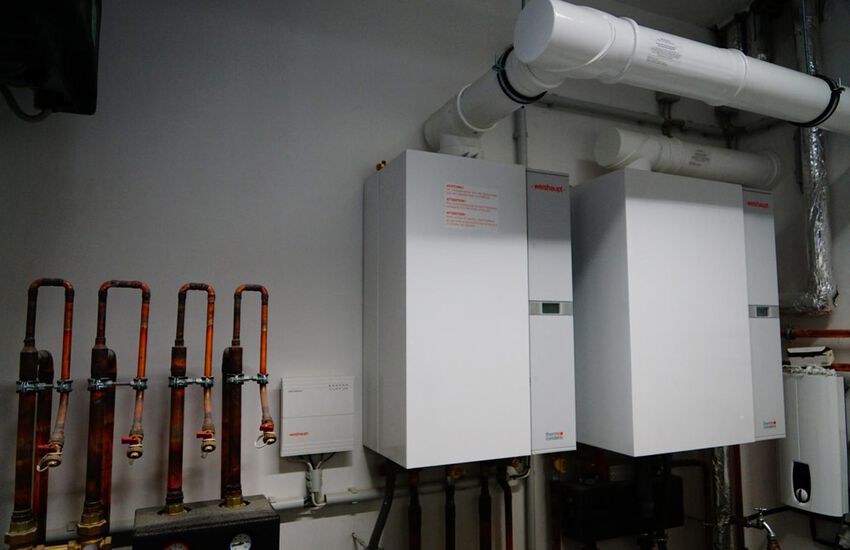 - Einbau von zwei Gasbrennwertgeräten für die Büroflächen, Leistung 60 kW und 32 kW, Fabrikat: Weishaupt