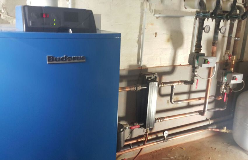 Einbau eines bodenstehenden Gas-Brennwertgerätes, Buderus 60 kW mit Warmwasserbereitung 400 Liter